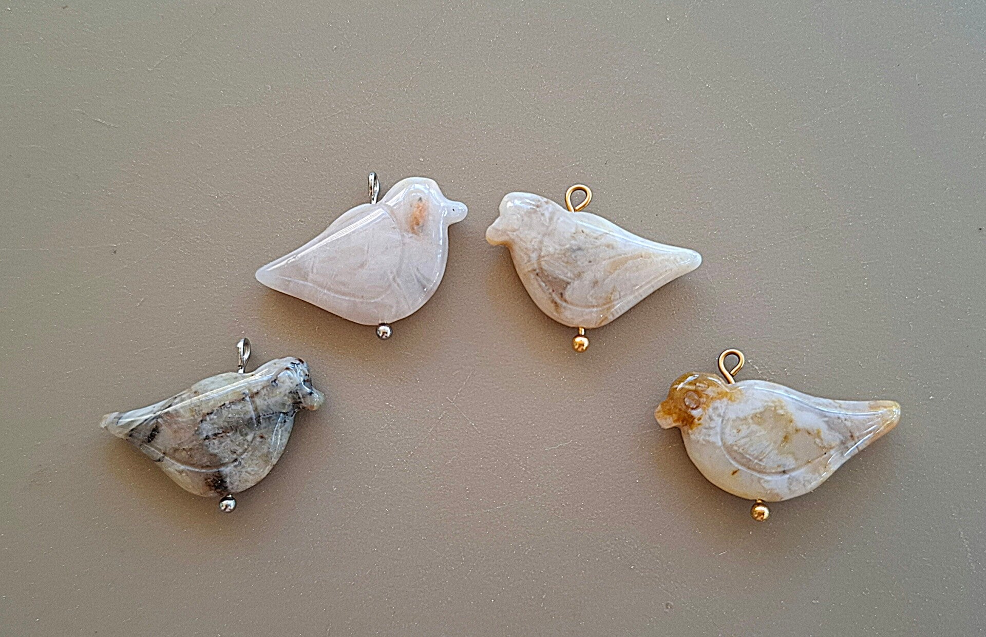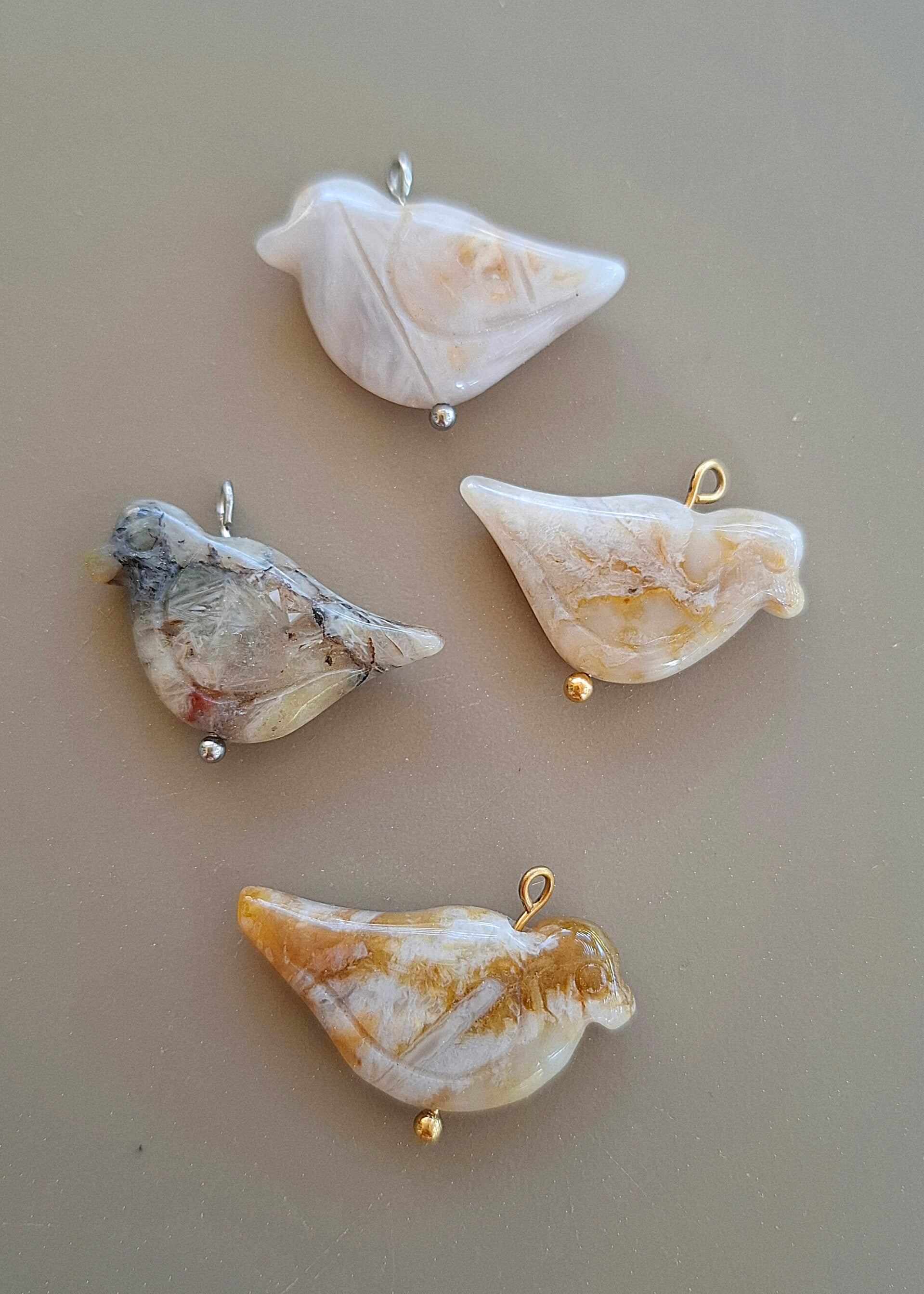 Handgemaakte agaat hanger in de vorm van een duifje, afgewerkt met silverplated of goldplated rvs oogje.