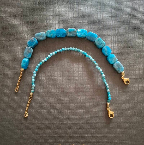 Stack je edelsteen armbanden in edelsteen soort bij elkaar. Bij deze grovere apatiet armband past de apatiet mini edelsteen armband rvs goldplated ook fantastisch, een complete eenheid aan armbanden in één edelsteen soort.
