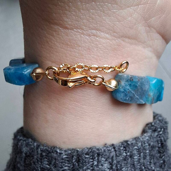 Laat deze prachtige natuurlijke apatiet edelsteentjes het werk voor je doen, de aandacht trekken. Deze goldplated apatiet armband geeft je een classy uitstraling en maakt jouw stijl uniek.