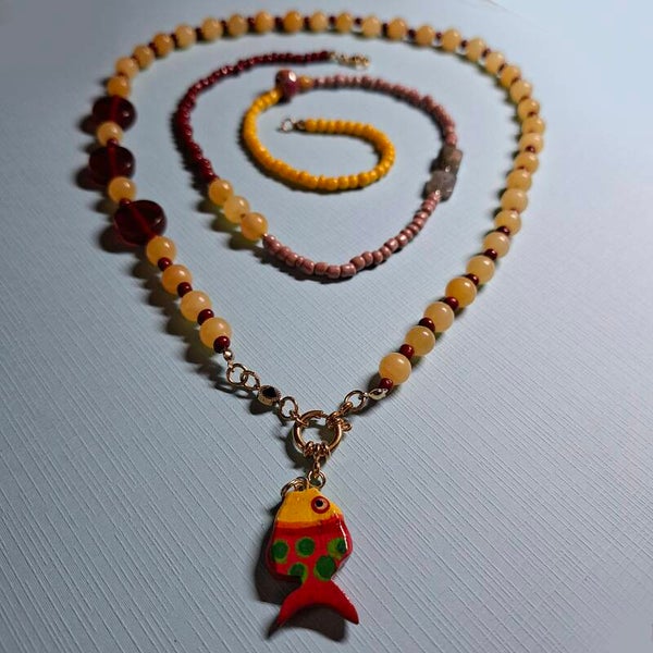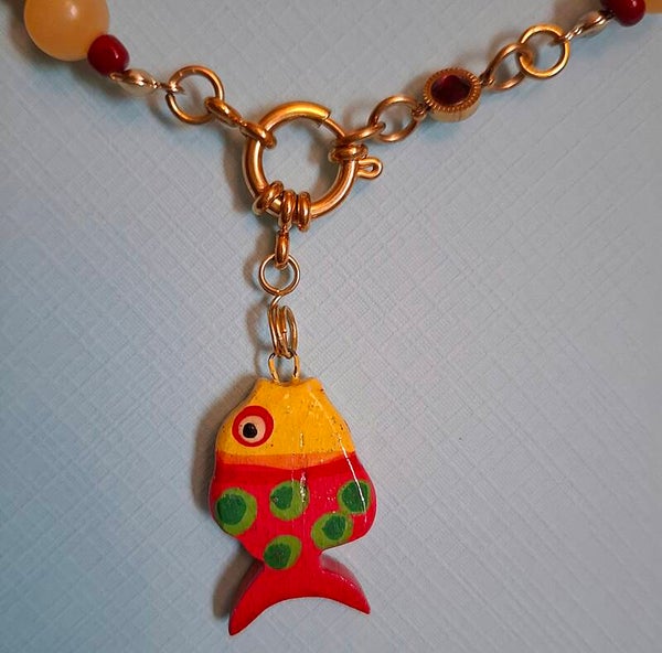 Materialen: gele calciet, diverse glas- en natuurstenen kralen, houten vis-hanger