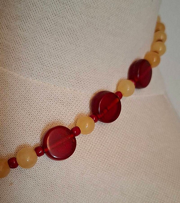 De Sunset ketting vangt het warme, zachte licht van de ondergaande zon in een krachtig, handgemaakt sieraad. Deze unieke statement ketting is samengesteld uit kralen in stralend geel en warm rood, zorgvuldig gekozen om een natuurlijke gloed en levendige warmte uit te stralen.