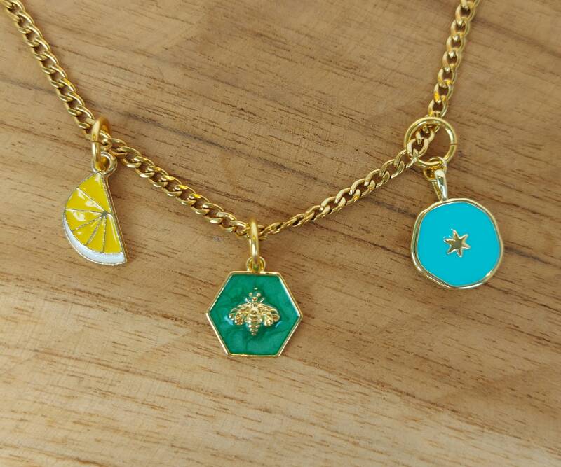 Als voorbeeld zijn deze drie bedeltjes gestyled aan Oriana ketting. Als jij je bestelling plaatst, maken we de bedels aan de schakels vast. Je kunt er ook voor kiezen om de bedels elk aan een slotje te maken en deze zelf te bevestigen aan je ketting op de manier die jij wilt. Je bent met een slotje aan je bedel extra flexibel en kunt ze ook eens aan je sneaker bij de veters bevestigen of aan je tas, aan je portemonnee, de mogelijkheden zijn eindeloos; wees creatief!