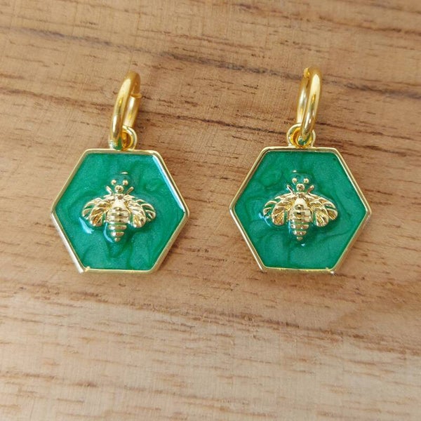 Green bee bedel is platte bedel in hexagon vorm met een kleine bij in het middel in groen emaille en goldplated afwerking. Emaille bedels zijn en blijven altijd leuk om mee te combineren. Het is leuk om met vormen te spelen en verschillende bij elkaar uit te kiezen en deze zeshoekige bedel is daar een hele leuke BIJ. :-D