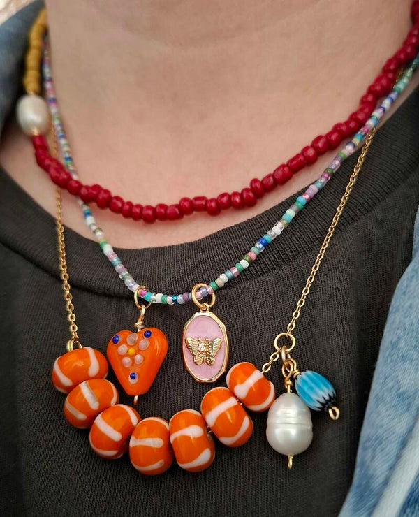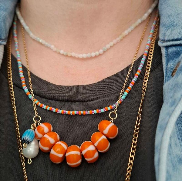 De Striped Summer ketting is hier gecombineerd met een smalle kralenketting; Tropicolor die goed combineert door de eveneens oranje kraaltjes, de andere kraaltjes zijn turquoise of hebben een roze kern. Een tropisch feestje om je hals. De lange ketting is de Oriana goldplated ketting van 70 cm met een roze opaal hanger.
