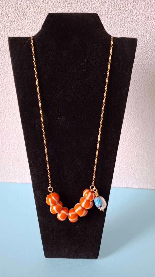 Deze vrolijke goudkleurige ketting is 51,5 cm lang. De 7 oranje met wit gestreepte glaskralen zijn geregen aan een fijn kettinkje en kunnen vrij bewegen aan het kleine kettinkje dat is verbonden met de lange ketting. Aan 1 zijkant hangen een grote natuurlijke parel en een millefiori kraal in een prachtige blauwe tint. Je kan kiezen of je het links of rechts wilt dragen, beide zijden zijn draagbaar. De lange ketting is afgewerkt met een rvs goldplated karabijnslot.