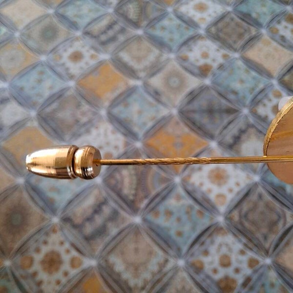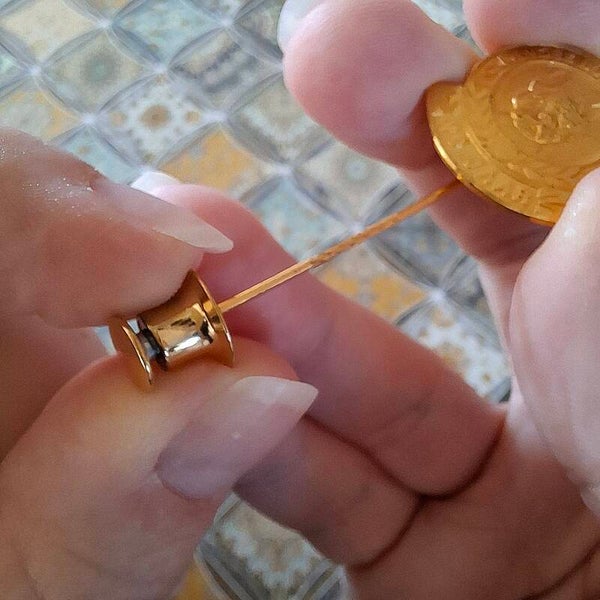 De goudkleurige honden broche speld is 6,2 cm lang en 2,35 cm breed op het breedste punt. Er is geen merkje zichtbaar op de pin. De pin is gemaakt van metaal met goudkleurige finish en werd ter ere van het 90-jarig bestaan van de Hollandse Buldoggen Club in 1997 vervaardigd en verkeert in zeer goede staat. Er worden bij de honden speld zowel de originele pin stopper als een extra, nieuwe stopper, gemaakt van stainless steel, geleverd. De steel van de goudkleurige speld heeft vanaf 1,8 cm vanaf de bovenkant van de steel een twist die 1,1 cm lang is en weer overgaat in glad metaal tot het uiteinde. Deze speld is vrij uniek te noemen en is alleen met een zachte doek opgepoetst en nagekeken op de staat van zijn, het scherpe puntje en de stopper. Je kunt je nagel tussen de twee verschillende onderdelen van de stopper schuiven en dan komt de stopper pas in beweging. Dus als de pin gesloten is, zit het vast. Nu voelt de originele stopper vrij losjes, en daarom heb ik gezocht naar stevige roestvast stalen stoppertjes om toch een stevige basis te kunnen waarborgen. De rvs stop heeft een gesloten onderzijde en de originele stop niet.