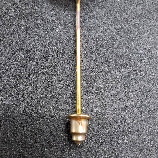 De vintage broche heeft gebruikssporen; wat je vooral terugziet in wat kleine stipjes op het bladermotief bij de goudkleurige gedeeltes, zie ook op detailfoto. Op de pin zelf is de goudkleurige coating op 5 plekken weggesleten tot het kern metaal. Enige voorzichtigheid is geboden bij het vastspelden van deze dasspeld met extra aandacht voor de kleding waar je doorheen steekt. Bij deze lange pin met klassieke uitstraling krijg je een extra stoppertje (nieuw). Het bijbehorende stoppertje is in gebruikte staat, functioneert nog goed, maar voor de zekerheid toch een extra stoppertje erbij als service.