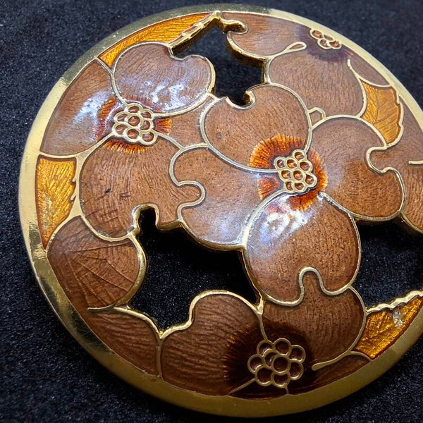 Bij deze broches wordt de koperen basis in een mal verwerkt tot broche met kant en klare vakjes, waarna handmatig de kleuren een voor een worden toegevoegd. Het is een heel delicaat en secuur proces waarbij uiteindelijk een vlakke laag emaille zichtbaar is met in dit geval minimaal opstaande randjes van de tussenschotjes die met een zeer dunne laag goud zijn afgewerkt. Je ziet zelfs nerfjes in de bloemblaadjes en de bladeren, wat de klassieke uitstraling van deze prachtige broche nog meer vergroot. De harten van de bloemen zijn donker oranje met een goudoranje randje overgaand in de prachtige oudroze / misty roze kleur. De nerfjes van de harten lopen verticaal naar de uiteinden van de bloemblaadjes uit en de nerfjes van de bladeren zijn zo fijn dat het echt een klein kunstwerkje is. En dat kunstwerkje kan de jouwe worden! 🍂