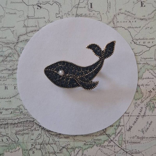 Deze blauwe walvis broche heeft een goudkleurige metalen basis en is helemaal ingelegd met donkerblauwe strass steentjes en een fake parel oogje. De lijnen zijn aangezet met goudkleurige stippen. De strasssteentjes zijn facetgeslepen en glinsteren bij elke beweging. De speld is 5,1 cm breed en 2,9 cm hoog vanaf de staartpunt tot de onderste vin.