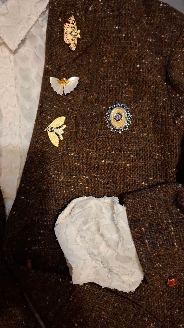 Of probeer deze broche eens met een fluffy blouse en een vintage tweed jasje in modekleur van nu: bruin. Zoals op deze bruine blazer, het geeft de outfit een frisse vibe en haalt het misschien wat ouderwets ogende jasje helemaal naar nu in combinatie met de crèmewitte fluffy hartjes blouse. Ik heb hier de gele mot gecombineerd met de roze mot en een vintage vlinder broche en op de borstzak vind je de ovale clip broche met een zilverkleurig roosje met amethist kleurig strass steentje op een bijpassende gele gewolkte achtergrond. Het maakt dus niet uit dat deze in zilverkleurige setting is en de andere goudkleurig. Door het gele element dat ze allemaal combineert, is het een complementerend geheel geworden. Je ziet geel, botergeel, peach en goud als de verbindende factor in deze broches. Nieuwe en vintage vlinders in romantische zachte gele en roze tinten bij elkaar geeft een heel eigen uitstraling aan jouw outfit!