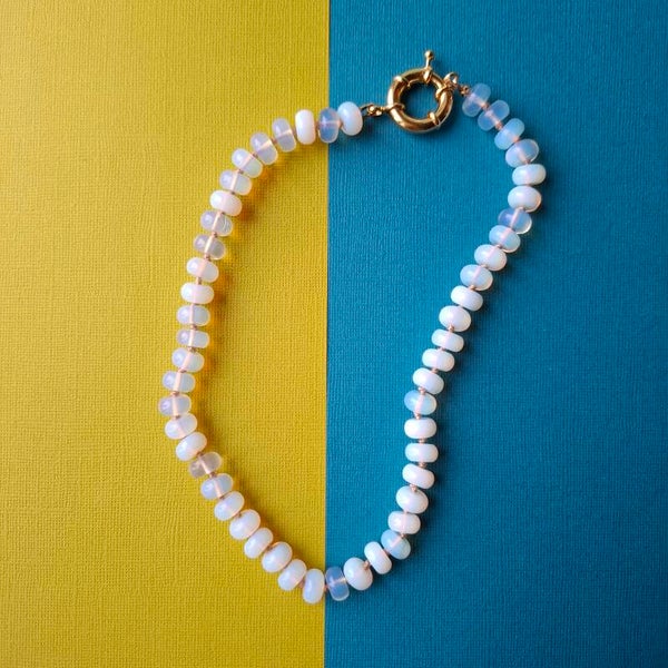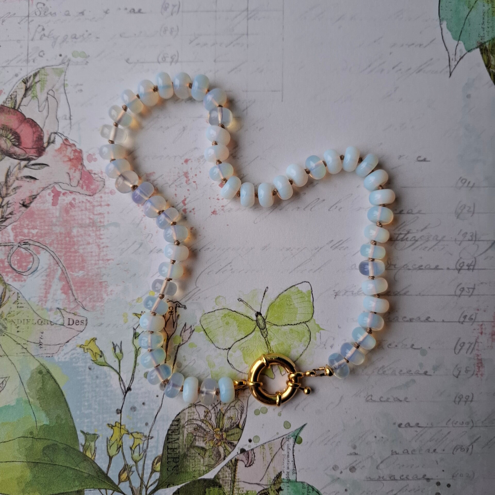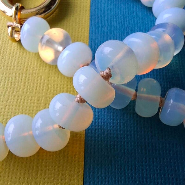 Deze one of a kind geknoopte opaliet ketting is 43-43,5 cm lang en is geregen op dubbel camel/beige draad. De rondelles zijn 10 x 8 mm groot en variëren van melkachtig wit tot doorschijnend transparante kralen of een beetje van deze beide in één. De chunky ketting is afgewerkt met stainless steel goudplated onderdelen en een groot (2 cm doorsnee) boeislot wat gezien mag worden. Draag het zoals jij wilt: vandaag met het grote slot naar voren, morgen met het slot achter.