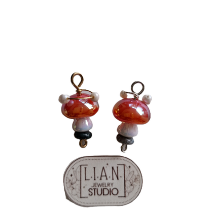 Paddenstoel bedel met rood/oranje metallicglans en echte parels als 'losse' stippen en 'mossy' India agaat. Uniek handgemaakt, ideaal voor je bedelketting of bedel armband.