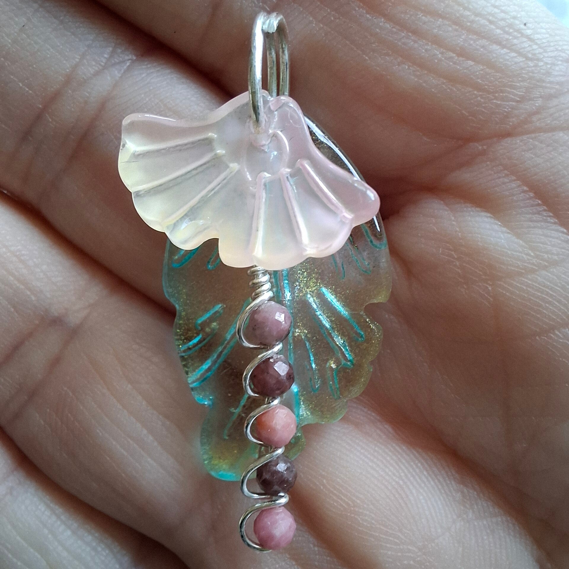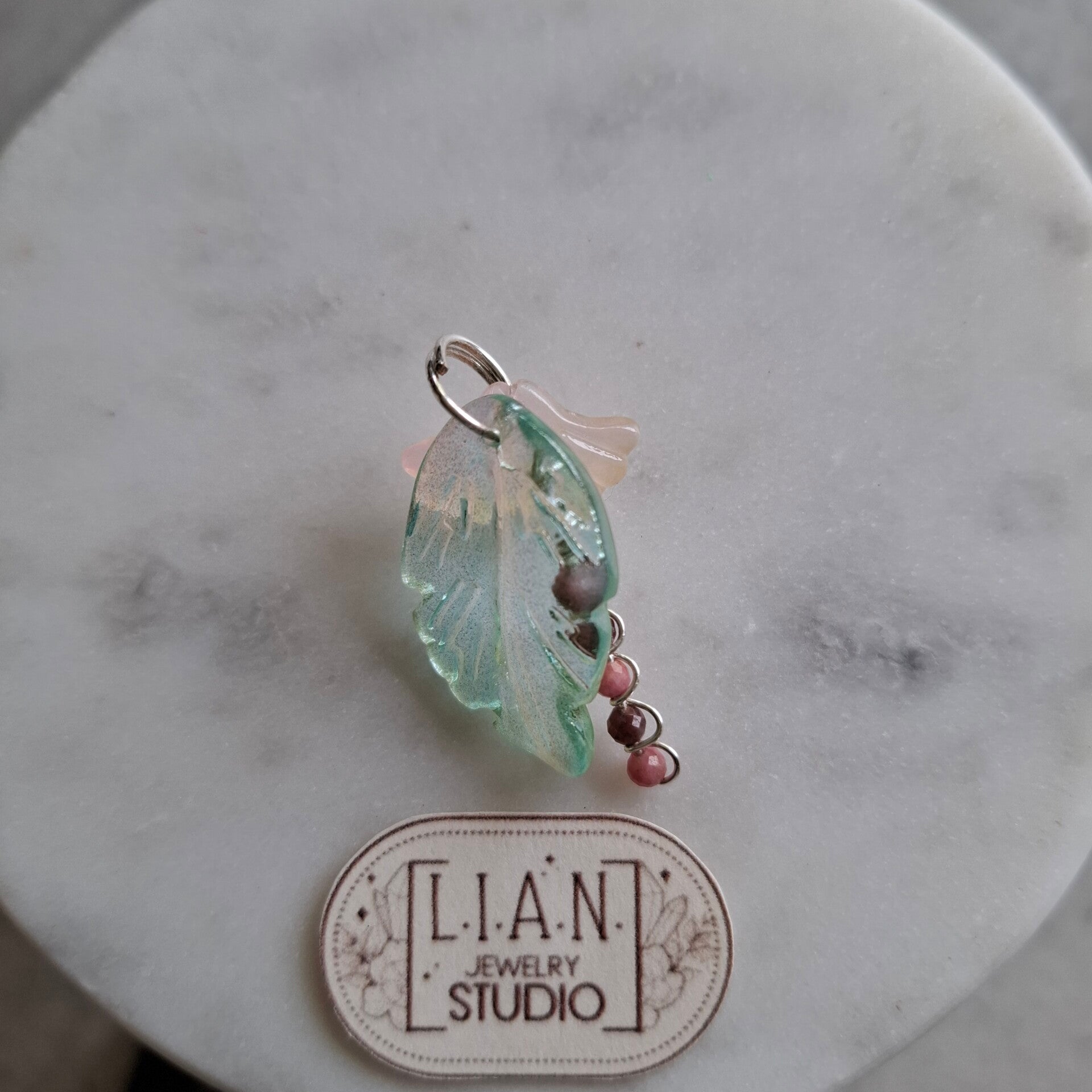 De Magical Leaves bedels zijn een ode aan de natuur. Een groot lichtblauw transparant blad met gouden glans combineert prachtig met een klein geel-roze ginkgo biloba blaadje. Daaraan is een takje met 'besjes' toegevoegd, deze besjes zijn rhodoniet facet edelsteen kraaltjes. Fantasy en magisch bos vibes vertaald naar een stainless steel silverplated bedel / hangertje. Samen vormen ze een speelse en betoverende bedel.