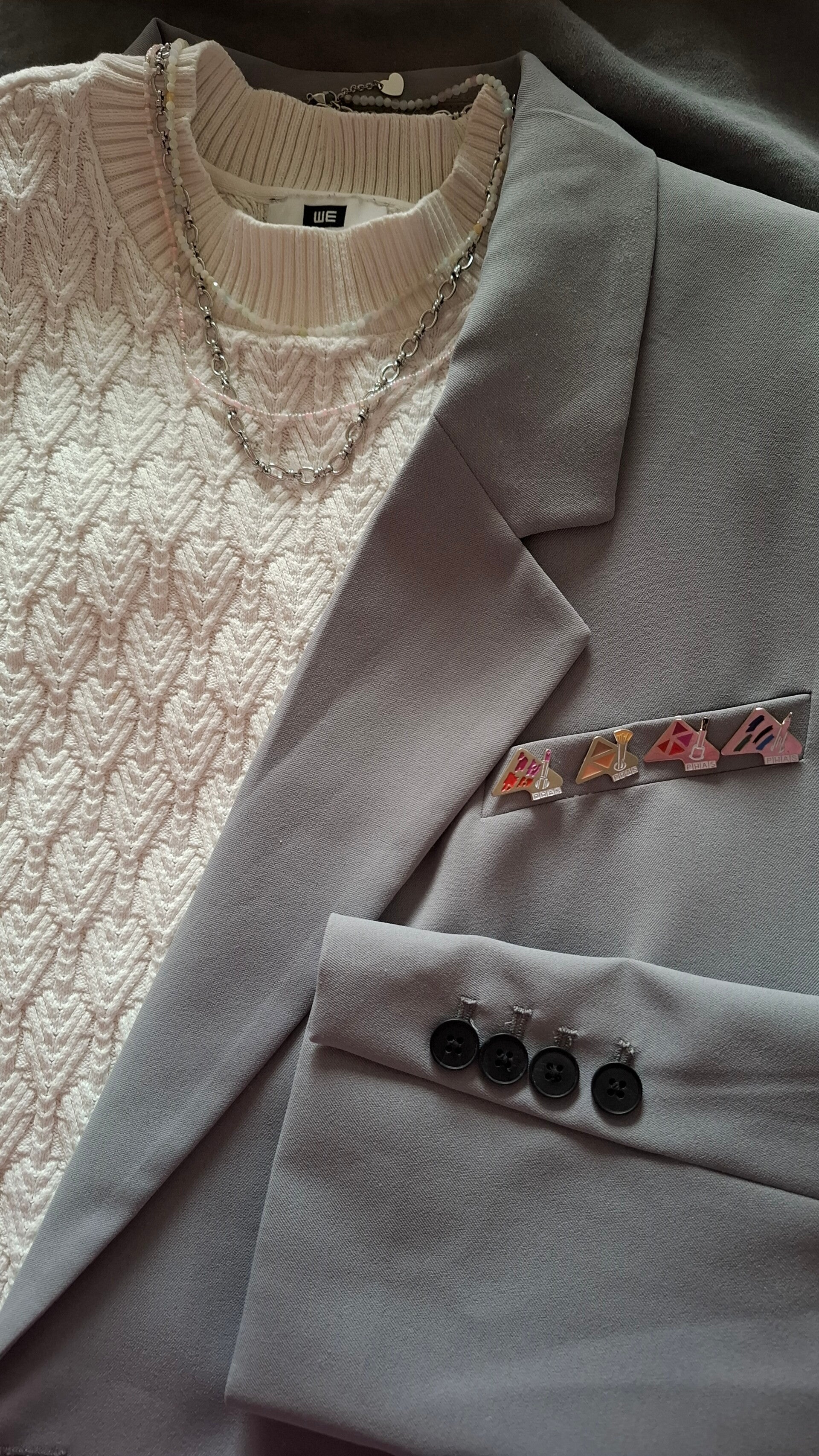 Hier is de basis een grijsblauwe oversized blazer, waar deze beauty pins prachtig tot hun recht komen.