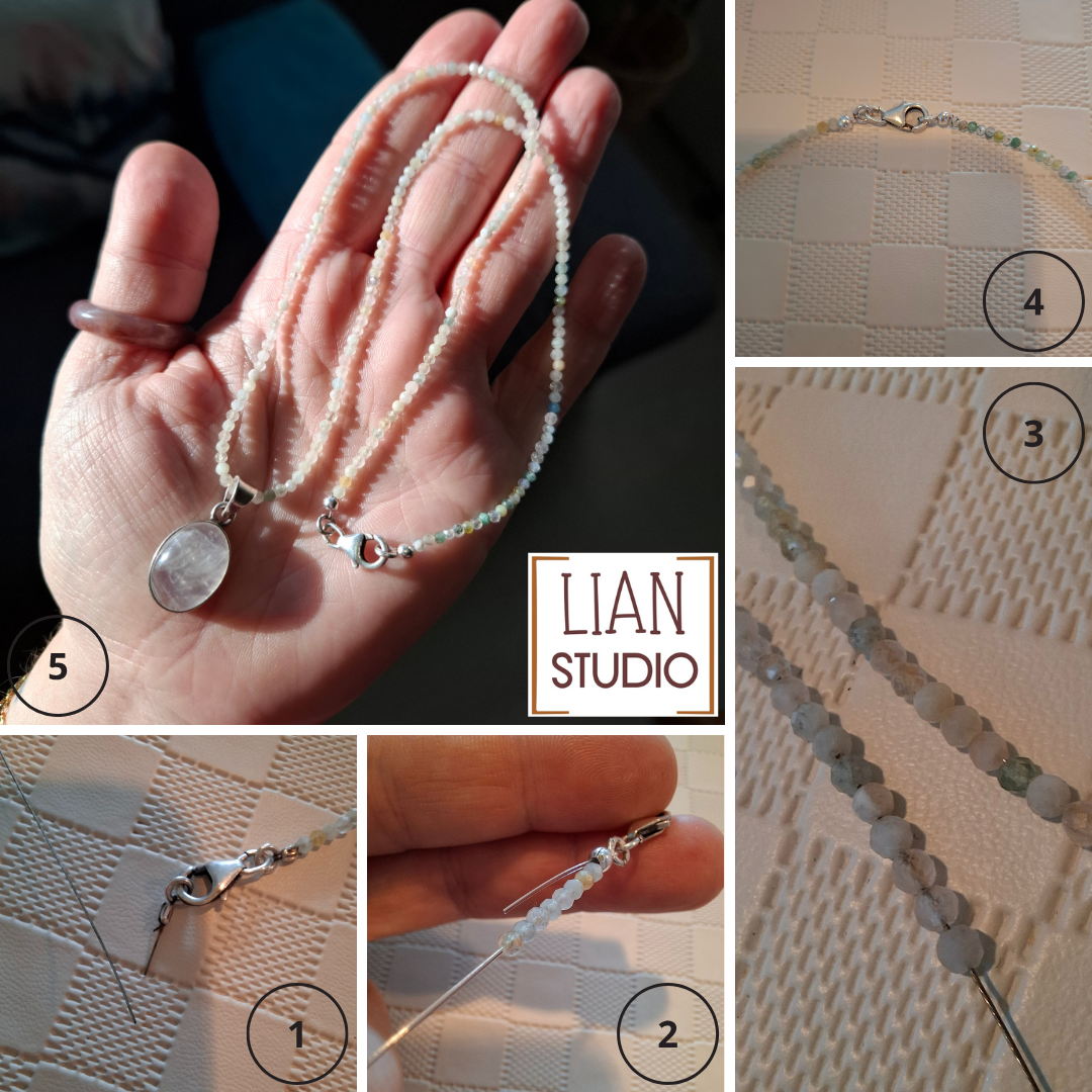 Op de foto is in volgorde van de cijfers 1-5 te zien hoe een het ijzerdraad van een beril ketting (net zoiets als onze mini edelsteen kettingen) was gebroken vlak naast de sluiting. Met hergebruik van de originele ringetjes en het slotje heb ik de draad vervangen. De ketting knapte op, zie plaatje 3; de bovenste draad is de nieuwe elastische draad en onder is de oude ijzerdraad die de transparante beril kraaltjes geen eer aandeed. Aan het einde heb ik de ketting aangevuld met de best bijpassende transparante mosagaat kralen uit mijn voorraad. Bedankt voor het vertrouwen om je ketting te mogen herstellen Krisztina!