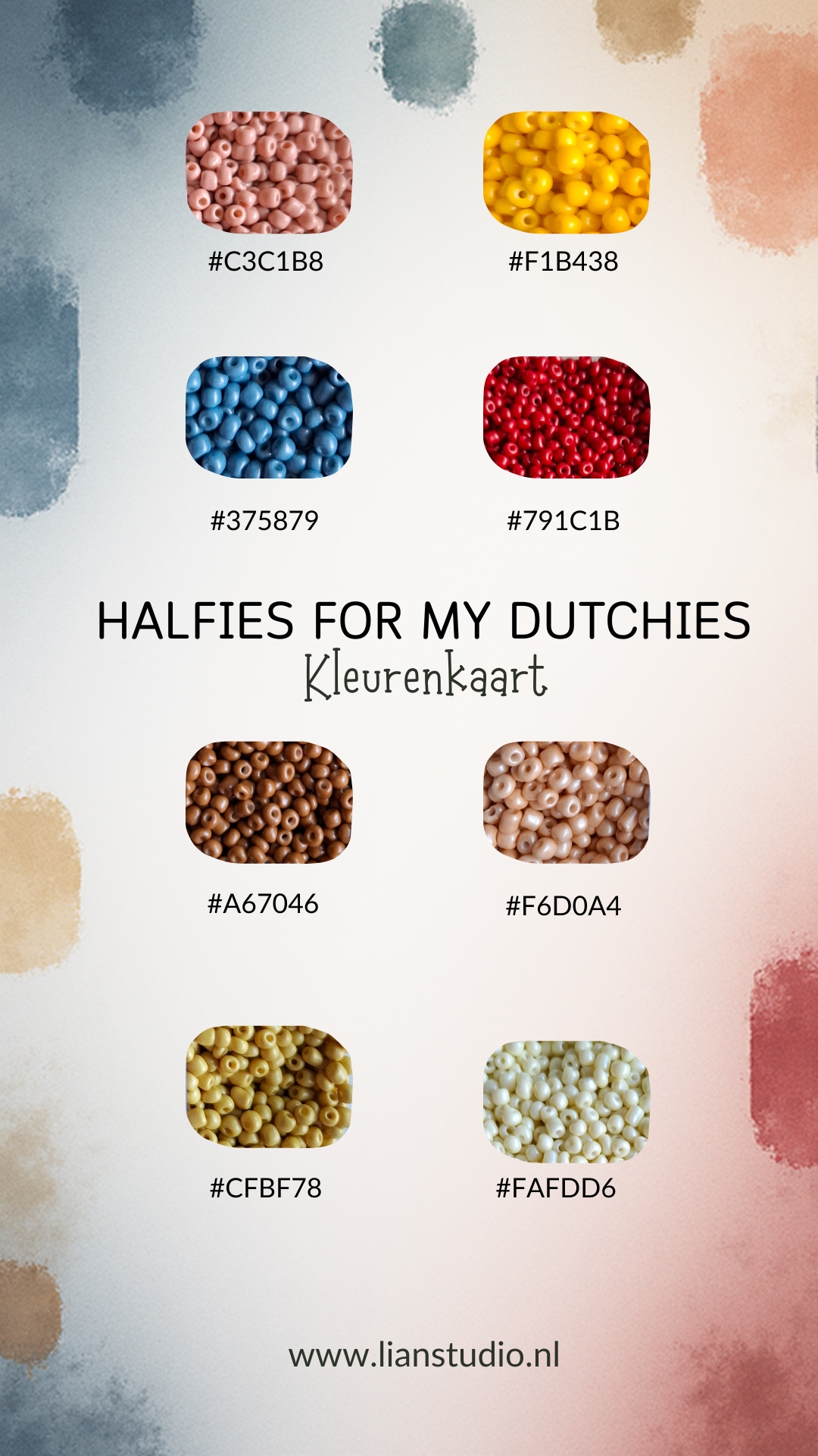 De kleuren hierboven en van de foto's kunnen mogelijk afwijken van de originele kleuren van de kralen van de Halfies. Ik heb zo dichtbij mogelijk de kleur gezocht die het meest op de kleur van de echte kralen lijkt. Het kan afwijken door factoren als de lichtbron en de instellingen van je device.